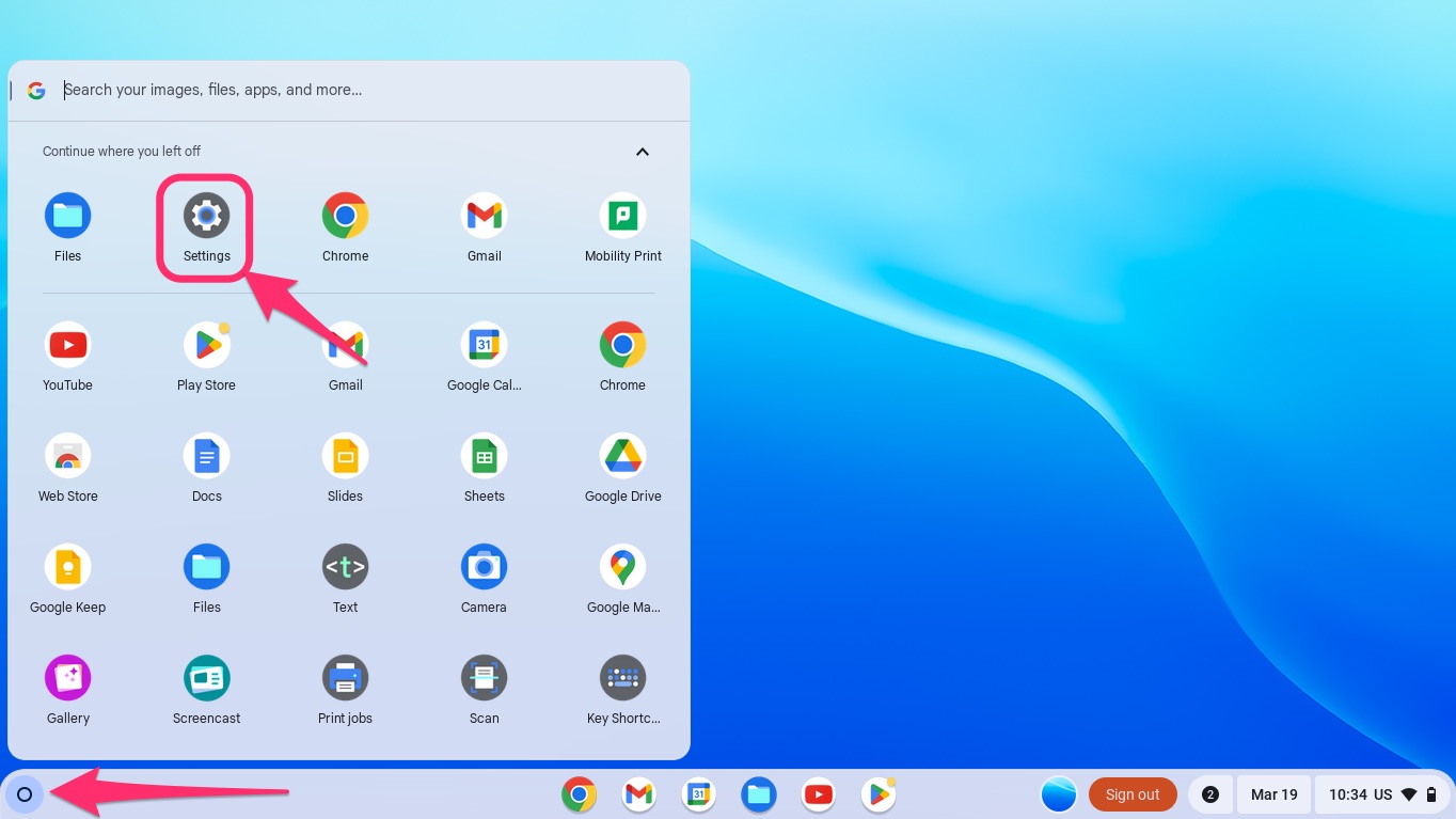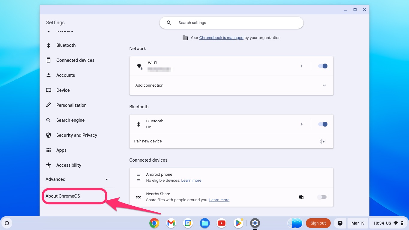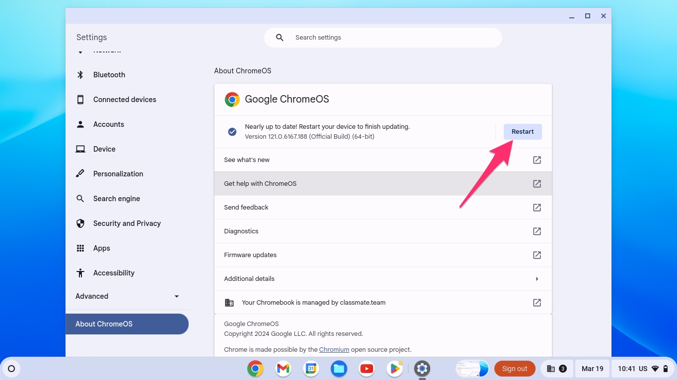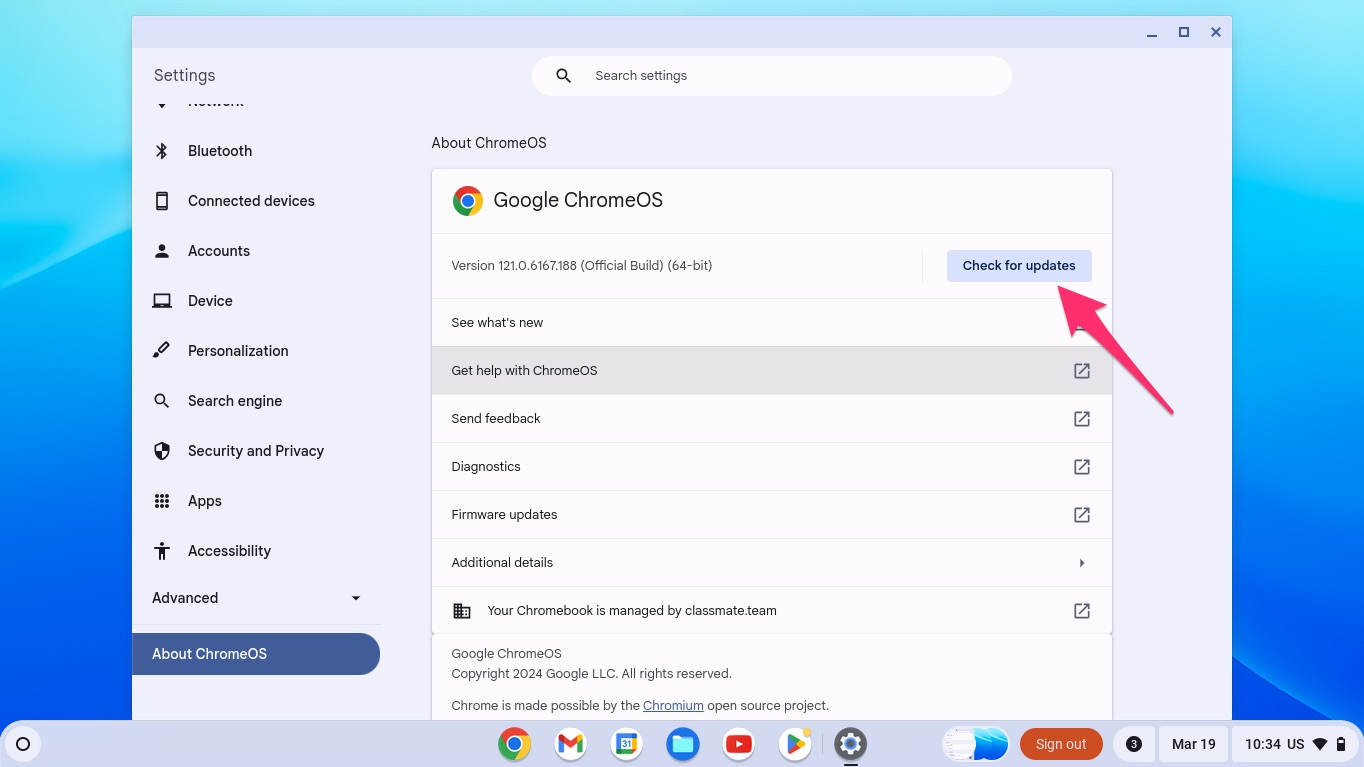 Click "Check for Updates". The Chromebook will automatically download all relevant software updates.